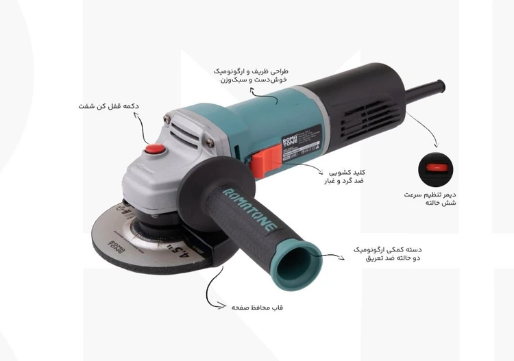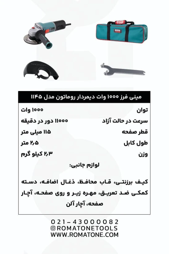 مینی فرز 1000 وات روماتون، کم حجم و سبک بوده و بهراحتی قابل حمل است. این ابزار دارای لوازم جانبی زیادی از قبیل کیف برزنتی، دستة کمکی، قاب محافظ، آچار صفحه، زغال اضافه، آچار آلن و یک عدد مهرة زیر و روی صفحه است.