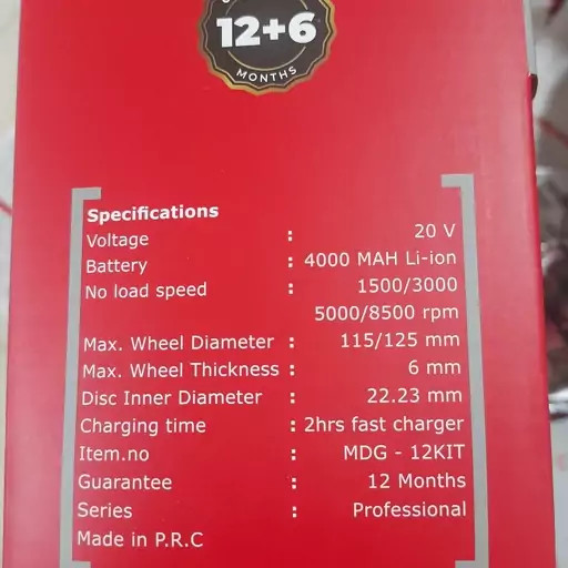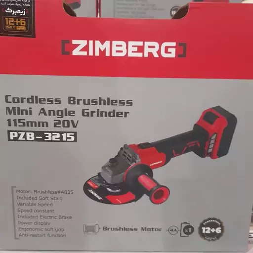 مینی فرز شارژی براشلس زیمبرگ با باتری 20 ولت 4 آمپر ساعتی با ۱۸ ماه گارانتی (12+6) در سراسر ایران لوازم جانبی: محافظ صفحه: 1 عدد فلنچ: 2 عدد دسته جانبی: 1 عدد آچار: 1 عدد کیف BMC مشخصات فنی مدل دستگاه PZB-3215 ولتاژ20 ولت باتری لیتیمومی4000 میلی آمپر سرعت در حالت آزاد 1500/3000/5000/8500دور در دقیقه حداکثر قطر صفحه115/125 م م حداکثر ضخامت صفحه6 م م زمان شارژ2 ساعت شارژ سریع